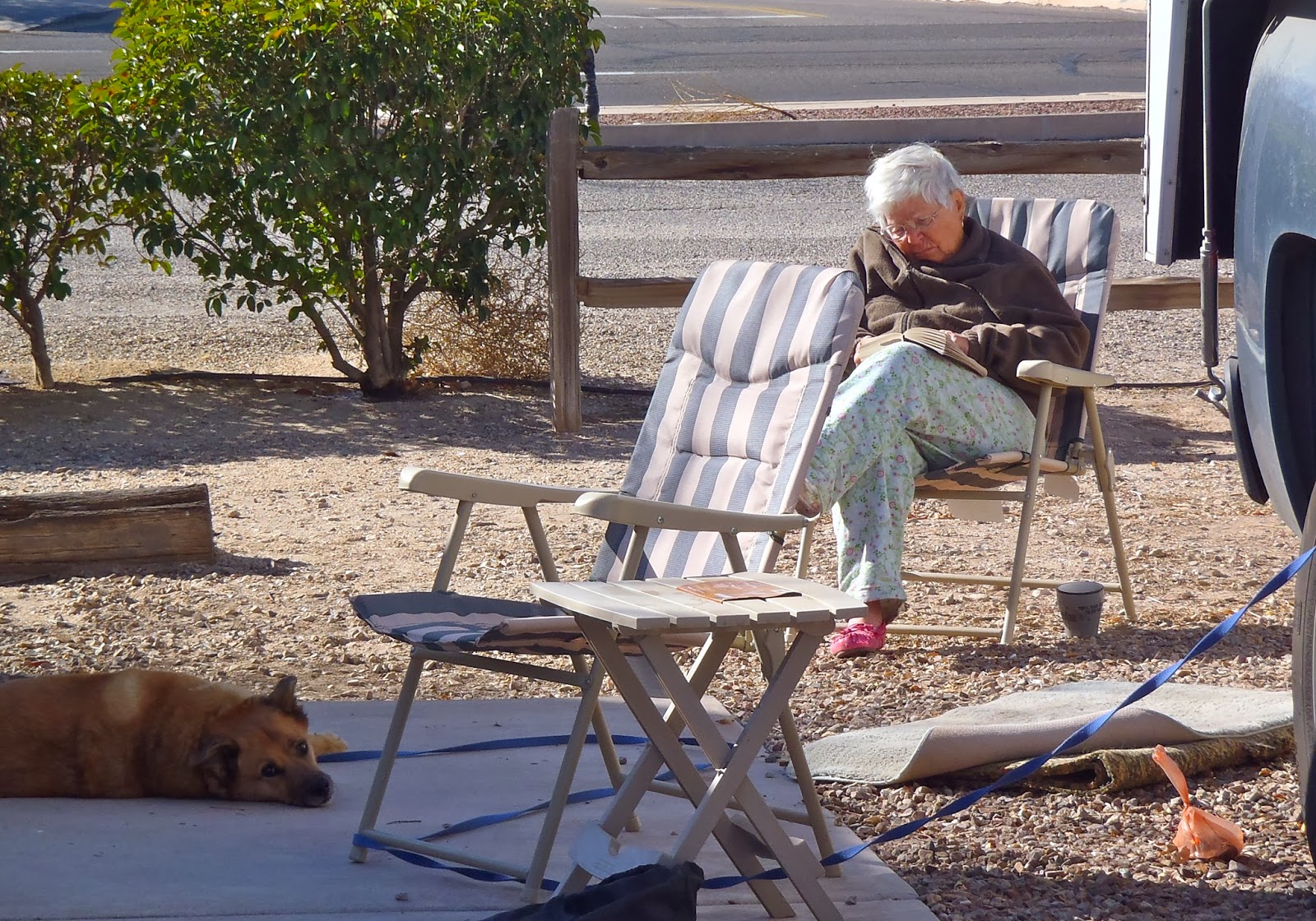 Lyn reading in the sunshine. Casey whispers, "That wiggly puppy Audrey isn't coming back over, is she? I like her but I only visit with her in shifts and my shift is over and it's rest time, now."